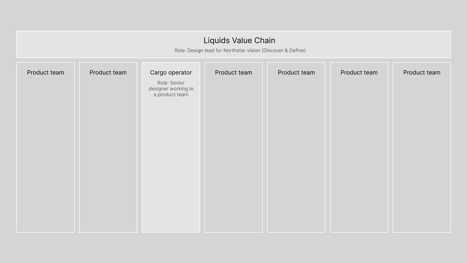 I started by mapping the full picture (Boulder -> Rocks -> Pebbles). Through workshops, I built an ecosystem map of every role in the liquids value chain.