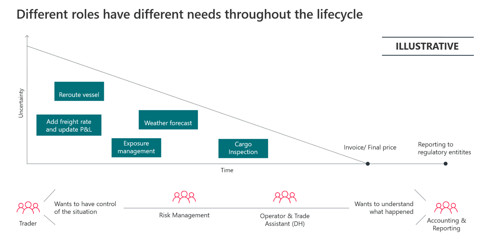 The core idea: a single centralised hub where every mapped role — trader, cargo ops, risk, back office — works from one platform. Each role gets a customisable dashboard tailored to their login credentials and responsibilities.